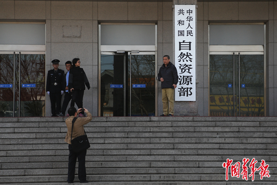 2018年4月10日,自然资源部门外,一名男士在合影留念。中青报·中青网记者 赵迪/摄