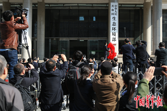 2018年4月16日上午,北京,国务委员兼国务院秘书长肖捷为生态环境部正式揭牌。根据新的国务院机构改革方案,组建生态环境部,不再保留环境保护部。中青报·中青网记者 赵迪/摄