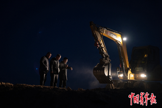 12月13日晚,督察组调来挖掘机,对疑似倾倒、掩埋固体废料的区域进行挖掘作业。