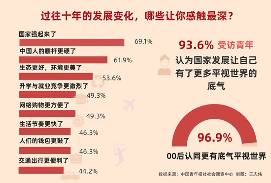调查显示,对于过去十年的发展变化,69.1%的受访青年认为国家强起来了让自己感触最深,61.9%的受访青年觉得是中国人的腰杆更硬了,53.6%的受访青年认为是天更蓝,山更青,水更绿,生态更好,环境更美了。