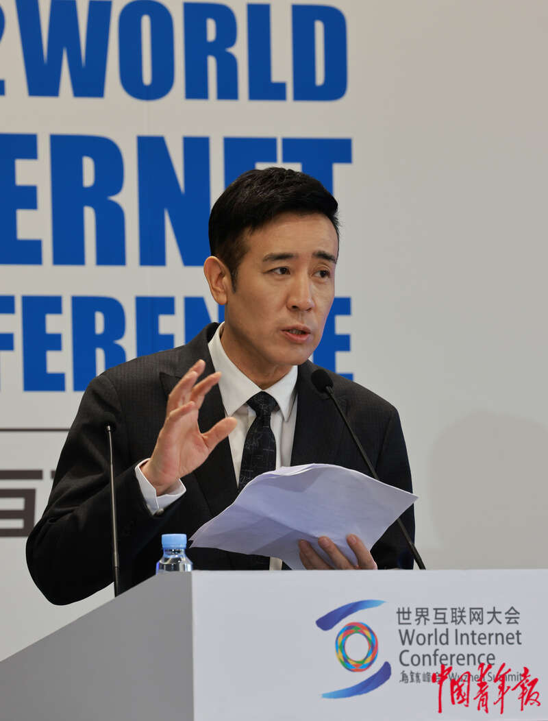 11月10日,浙江省桐乡市乌镇互联网国际会展中心,2022年世界互联网大会乌镇峰会分论坛之一“疫情下的数字社会”现场,演员于和伟发言。他介绍了数字技术对影视行业的改变,例如过去剧组需要“上山下海”去实地勘景,如今可以通过VR技术云勘景,大大节省了时间和成本。疫情期间,于和伟所在的剧组无法线下围读剧本的时候,会采取线上剧本研讨会的方式来和整个主创团队一起梳理剧情和人物,系统可以即时地生成文本,给工作带来很多便利。中青报·中青网记者 曲俊燕/摄