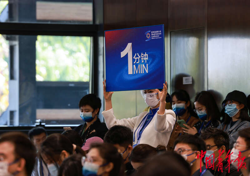 11月10日,浙江省桐乡市乌镇互联网国际会展中心,2022年世界互联网大会乌镇峰会分论坛之一“疫情下的数字社会”现场,工作人员提示发言嘉宾剩余时间。中青报·中青网记者 曲俊燕/摄