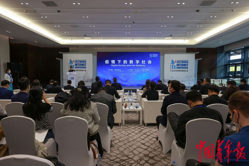 11月10日,浙江省桐乡市乌镇互联网国际会展中心,2022年世界互联网大会乌镇峰会分论坛之一“疫情下的数字社会”现场,受邀嘉宾们在听会。中青报·中青网记者 曲俊燕/摄