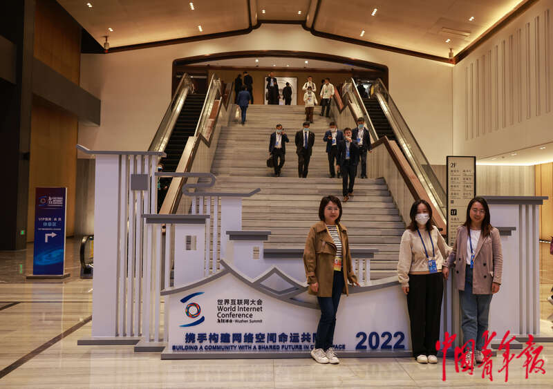 11月10日,浙江省桐乡市乌镇互联网国际会展中心,2022年世界互联网大会乌镇峰会分论坛之一“疫情下的数字社会”结束后,与会嘉宾走出会议厅。中青报·中青网记者 曲俊燕/摄