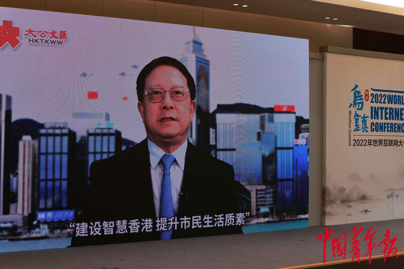 11月10日,浙江省桐乡市乌镇互联网国际会展中心,2022年世界互联网大会乌镇峰会分论坛之一“疫情下的数字社会”现场,香港大公文汇传媒集团董事长李大宏通过视频致辞。中青报·中青网记者 曲俊燕/摄