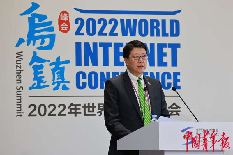 11月10日,浙江省桐乡市乌镇互联网国际会展中心,2022年世界互联网大会乌镇峰会分论坛之一“疫情下的数字社会”现场,牙买加驻中国大使丘伟基致辞。中青报·中青网记者 曲俊燕/摄