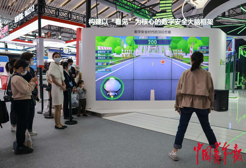 11月9日,浙江省桐乡市乌镇,在2022年世界互联网大会“互联网之光”博览会上,一名观众在体验电脑“杀毒”游戏。中青报·中青网记者 曲俊燕/摄