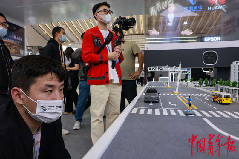 11月9日,浙江省桐乡市乌镇,在2022年世界互联网大会“互联网之光”博览会上,观众在近距离观察车路协同系统的沙盘。这个由中国电信和华为合作的系统,可以将监测到的路面异常情况实时上传至云端,并下发给路面后方的车辆,有效规避交通事故的发生。目前该系统已经在云南中缅边境一段主要供货车通行的道路上使用。中青报·中青网记者 曲俊燕/摄