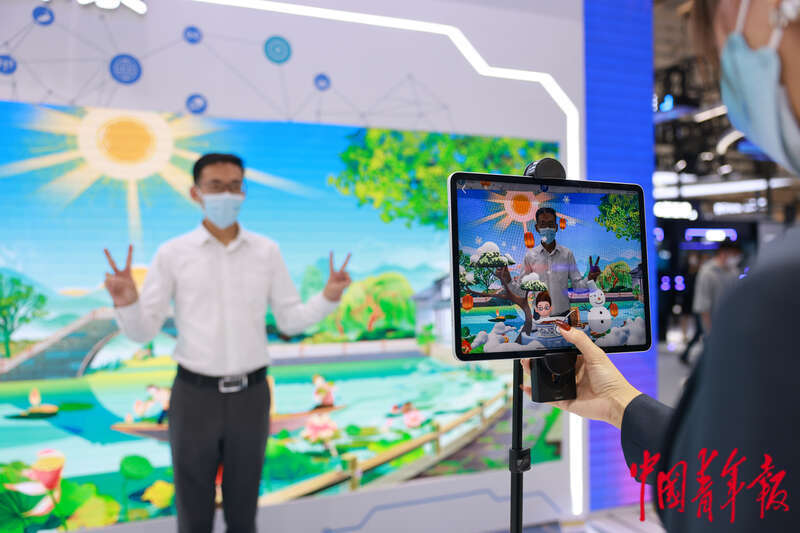 11月9日,浙江省桐乡市乌镇,在2022年世界互联网大会“互联网之光”博览会上,工作人员演示在AR(增强现实)系统中拍照,大屏展示着乌镇水乡元素的微动画,平板电脑屏幕上叠加四季风景的图案,形成虚实融合的AR拍摄体验。中青报·中青网记者 曲俊燕/摄