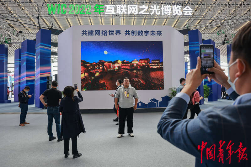 11月9日,浙江省桐乡市乌镇,在2022年世界互联网大会“互联网之光”博览会上,观众在显示着乌镇动画景色的屏幕前拍照。中青报·中青网记者 曲俊燕/摄