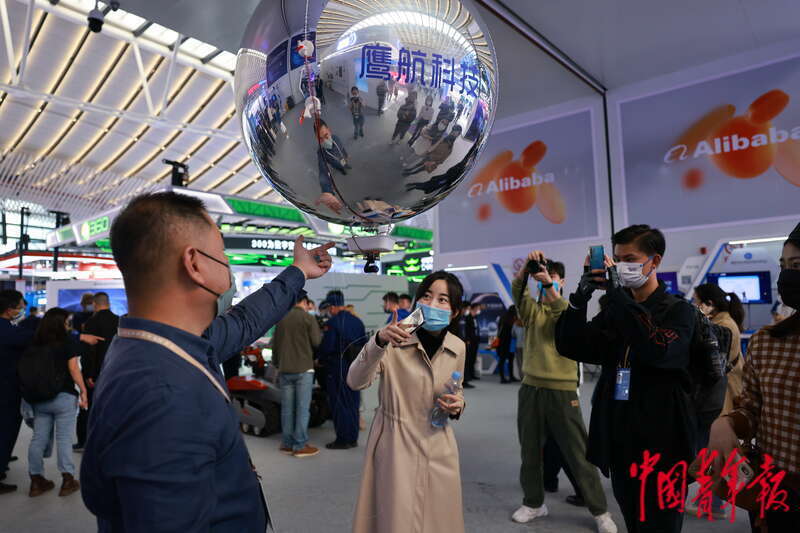11月9日上午,浙江省桐乡市乌镇,在2022年世界互联网大会“互联网之光”博览会上,工作人员在试飞一款氦气飞艇无人机,引得观众驻足观看。这款无人机可用于空中巡查等场景,以氦气为漂浮动力,电池控制转向和拍摄等功能,可以续航24小时。中青报·中青网记者 曲俊燕/摄