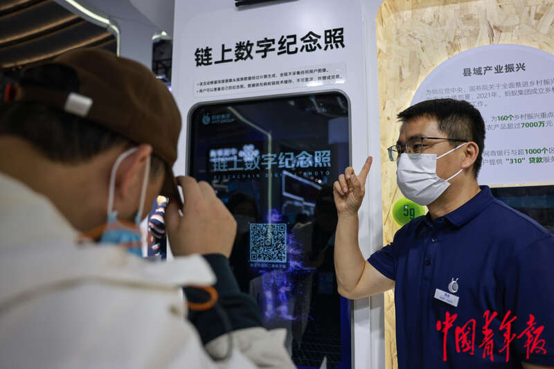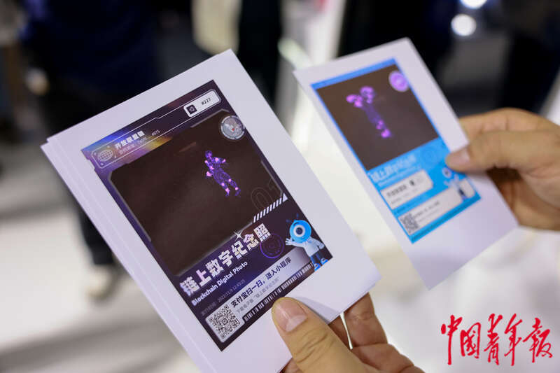 11月9日上午,浙江省桐乡市乌镇,在2022年世界互联网大会“互联网之光”博览会上,工作人员展示区块链数字纪念照。中青报·中青网记者 曲俊燕/摄