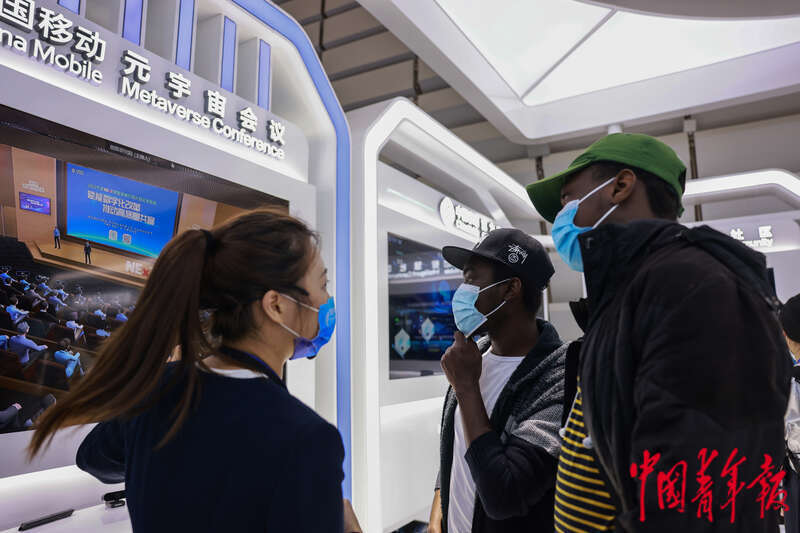 11月9日,浙江省桐乡市乌镇,在2022年世界互联网大会“互联网之光”博览会上,两名外国观众在了解元宇宙会议如何使用。中青报·中青网记者 曲俊燕/摄