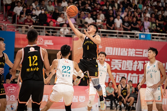 6月16日,四川省第三届“贡嘎杯”青少年校园体育联赛篮球总决赛上,成都体育学院球员李佳豪突破上篮。最终,西南交通大学队以81∶73战胜成都体育学院队,夺得冠军。“贡嘎杯”是目前四川规模最大、覆盖面最广、水平最高的校园体育赛事,本届“贡嘎杯”共有来自656支代表队的1.5万余名运动员参加,共产生26座冠军奖杯。汪龙华/摄