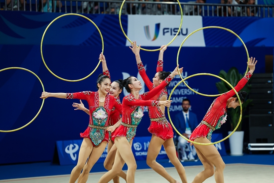 像一个不会醒的美梦,拿到第一枚金牌后,肖明欣感觉“整个人很懵”。她是成都体育学院(以下简称“成都体院”)艺术体操队的主力队员,她和同校另外5名队友一起,在本届大运会艺术体操集体项目中首次实现了登上世界大赛最高领奖台的愿望。