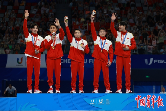 8月2日,四川成都,成都大运会体操男子团体决赛后,中国队(左至右)张博恒、侍聪、邹敬园、兰星宇、苏炜德在颁奖仪式上。中青报·中青网记者 曲俊燕/摄