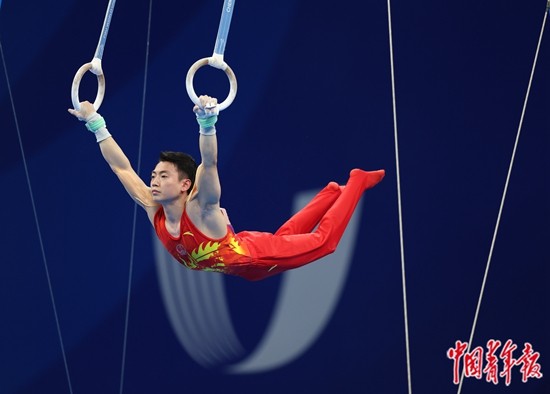 8月2日,四川成都,成都大运会体操男子团体决赛上,邹敬园在吊环比赛中。当日,由邹敬园、侍聪、苏炜德、兰星宇、张博恒组成的中国队在体操男子团体决赛中夺冠,将成都大运会体操项目首枚金牌收入囊中。中青报·中青网记者 曲俊燕/摄