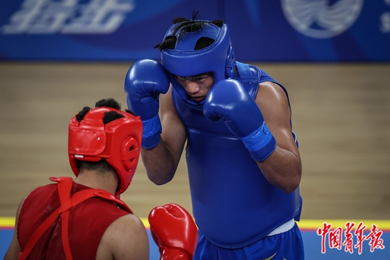 8月3日,成都大运会武术项目男子散打80公斤级比赛,中国选手柳文龙以2∶0击败对手摘金。中青报·中青网记者 赵迪/摄