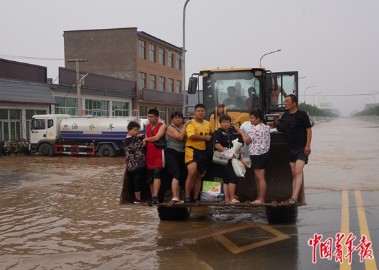 8月3日上午,河北涿州,涿州市靖雅学校附近,获救村民乘坐本地志愿者提供的铲车离开积水地段。中青报·中青网记者 李峥苨/摄