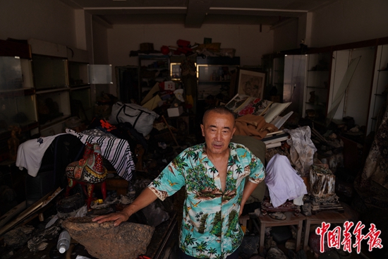 8月5日早晨,河北省涿州市,涿州邦创创业孵化基地,来自北京的古玩商家站在被洪水席卷过的店铺内,准备清点损失,复工复产。中青报·中青网记者 李峥苨/摄