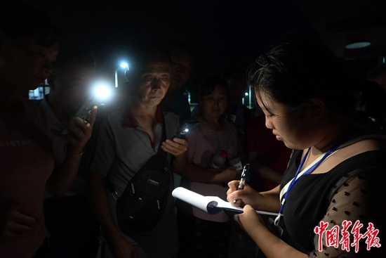 8月7日晚,北京市门头沟区大台街道玉皇庙社区社工小付(右)为即将入住安置点的受困村民办理登记。中青报·中青网记者 郑萍萍/摄
