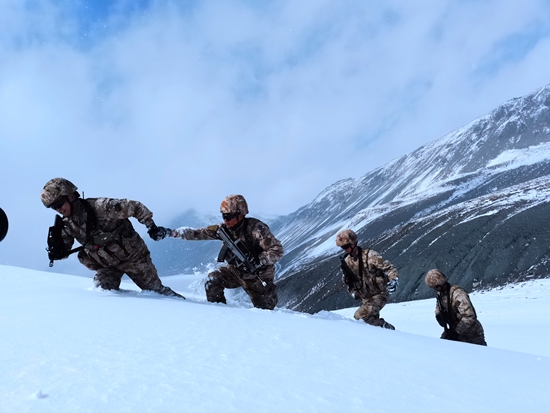 看到大学生士兵岳亮在雪坡上行进艰难,杨祥国抓住他的手,一边拉着他前进,一边向他传授巡逻经验:“在松软的雪地中行进,要调整好呼吸,呼吸节奏乱了会很吃力。来,把手给我,跟着我的脚印走。”