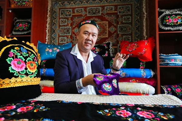 通过传统工艺工作站,一家文化公司看中了卡德尔的刺绣作品,以10万元的年薪聘请卡德尔担任首席设计师。公司每个月都会给他传来新的订单,接单后,卡德尔把订单分发给他带领的、从五六个人发展到100多人的绣娘团队,让这些绣娘足不出户,就可以靠刺绣增收。她们的作品被发往新疆多个景区,作为纪念品、伴手礼向游客出售。