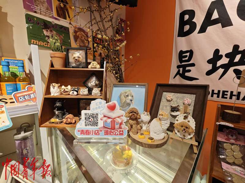 1月15日,重庆民主村,“汪大发”宠物杂货铺内摆放的“青春小店暖心公益”捐赠牌,小店每成交一笔生意,就向九龙坡区青少年发展基金捐赠1角钱。中青报·中青网记者 耿学清/摄