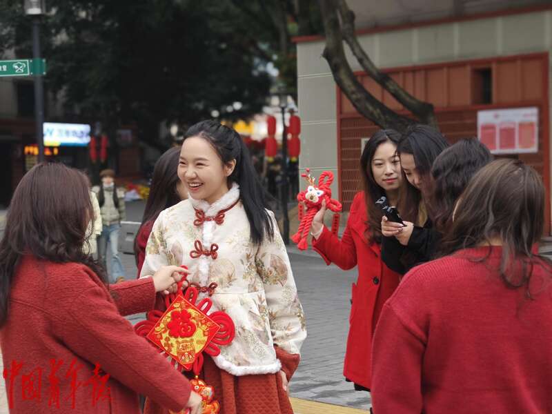 1月15日,重庆民主村,拿到对联的游客在合影。中青报·中青网记者 耿学清/摄