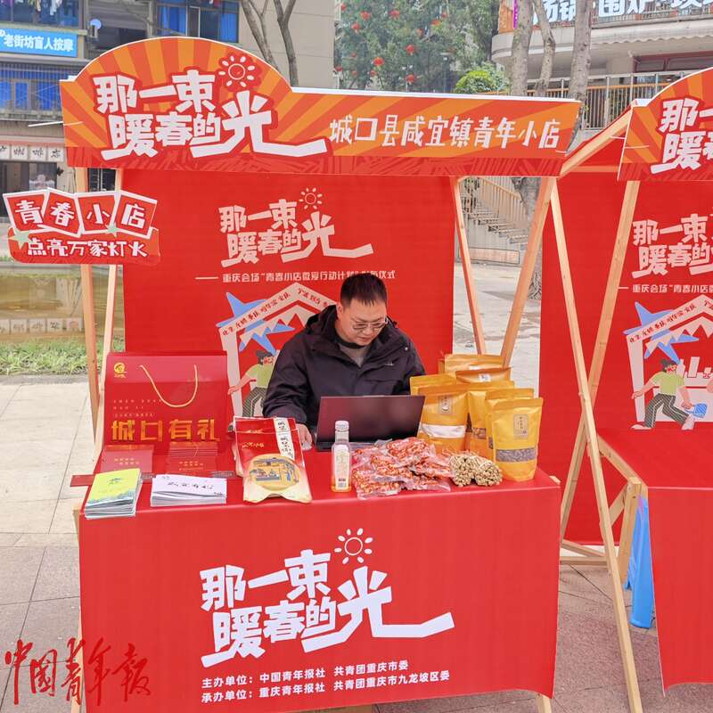1月15日,重庆民主村“青春小店快闪市集”,“那一束暖春的光”重庆会场活动开始前,来自重庆市城口县咸宜镇“咸宜印象”主理人、32岁的陈帅受主办方邀请在民主村摆摊,展示特产、年货。城口县位于重庆市最北端、大巴山腹地,是红色革命老区,也是南水北调中线水源地丹江口水库的源头之一。团重庆市委长期对其开展定向帮扶,推动全面发展振兴。中青报·中青网记者 耿学清/摄