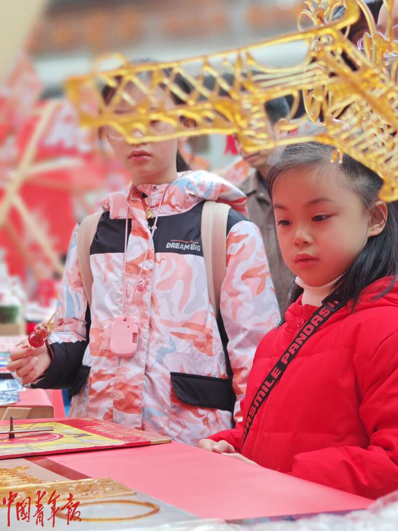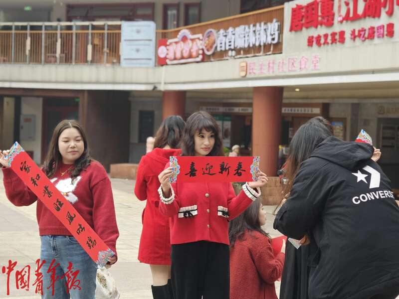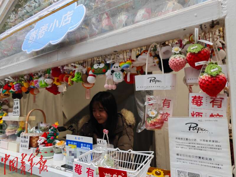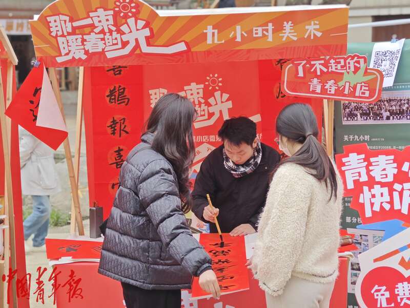 1月15日,在民主村同步举办的青春小店快闪市集上,许多青春小店的创业故事、爱心故事相聚于此。对联、糖画、剪纸、面塑、潮流手办、锦鲤挂饰……青春小店商家现场摆摊,青年书法爱好者现场写“福”字、春联赠送给居民、游客。