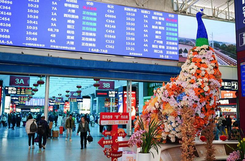 昆明火车站现繁花“孔雀” 扮靓春运旅途
