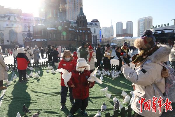 1月15日,哈尔滨圣·索菲亚大教堂前的广场上,游客们和鸽子嬉戏。中青报·中青网记者 王鑫昕/摄