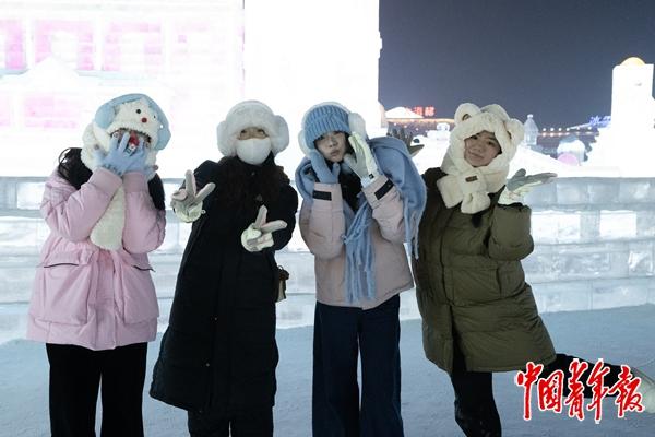 1月13日,黑龙江哈尔滨,冰雪大世界,4名大学生一起合影。她们分别来自广西、湖北和四川,同在四川读书的她们趁着放寒假的机会,相约一同来哈尔滨体验冰雪之旅。中青报·中青网记者 程璨/摄