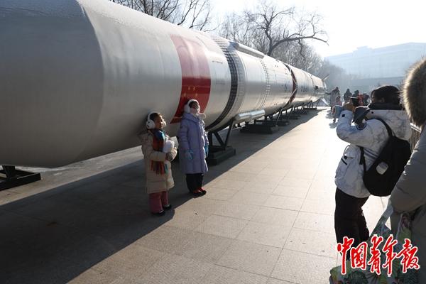 1月12日,哈尔滨工业大学航天馆旁边的户外展区,游客们在长征一号运载火箭实物旁合影留念。很多游客在哈尔滨体验冰雪的同时,把到哈工大校园里参观这些大国重器作为旅行的重要一站,感受国家科技力量。中青报·中青网记者 王鑫昕/摄