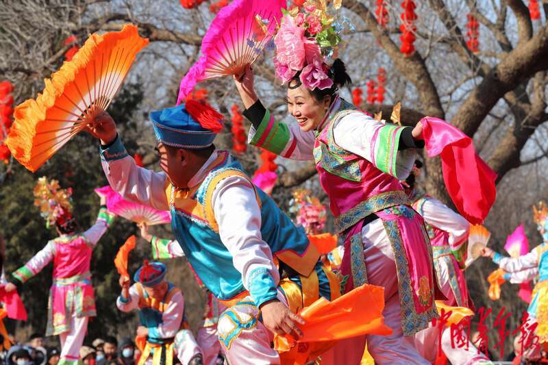 1月29日(正月初一),北京,第三十九届龙潭春节文化庙开幕式上的花会表演。当日,第三十九届龙潭春节文化庙会正式启幕。本届龙潭庙会以“都城万象焕新颜 京华春意乐大年”为主题,通过古都腔调、市井喧腾、都会烟火、京华风物、京彩冰雪、千树结彩六大板块内容,展现首都古韵与现代北京、春节民俗传统文化与潮流文化的有机结合。美食文创、曲艺花会、冰雪体育、棋类娱乐等体验内容精彩纷呈,为游客编织了一幅充满京味儿风情的新春画卷。中青报·中青网记者 李建泉/摄