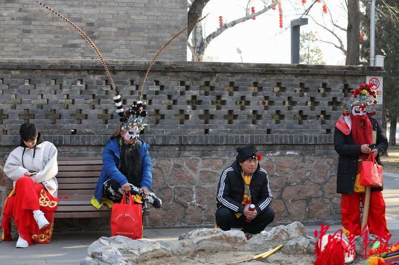 1月29日(正月初一),北京,第三十九届龙潭春节文化庙会,参加花会表演的演员在台下候场。中青报·中青网记者 李建泉/摄