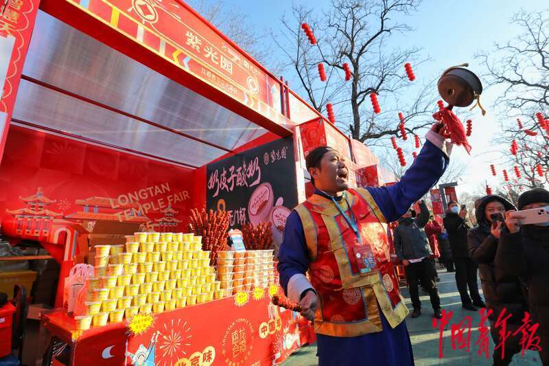 1月29日(正月初一),北京,第三十九届龙潭春节文化庙会上,随着京城非遗叫卖传承人臧志彪一声洪亮的开市吆喝,庙会正式启幕。中青报·中青网记者 李建泉/摄