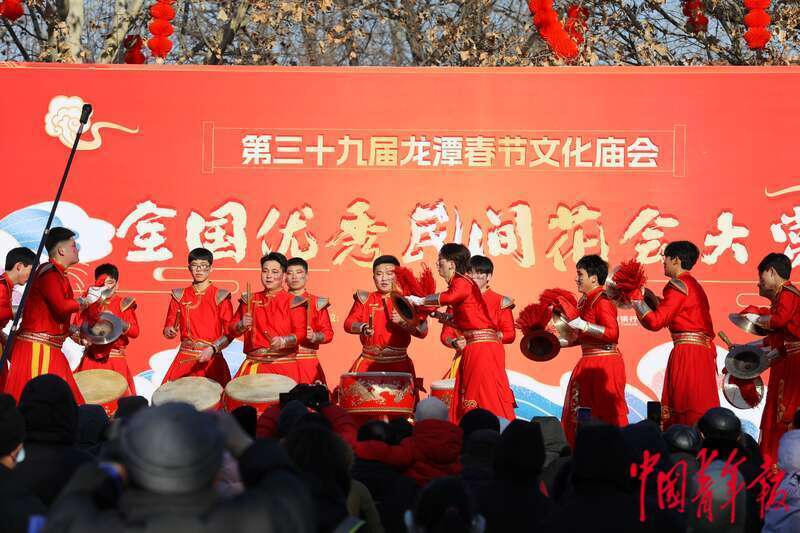 1月29日(正月初一),北京,第三十九届龙潭春节文化庙会,舞台上来自全国各地的特色花会表演,吸引了许多市民游客观看。中青报·中青网记者 李建泉/摄