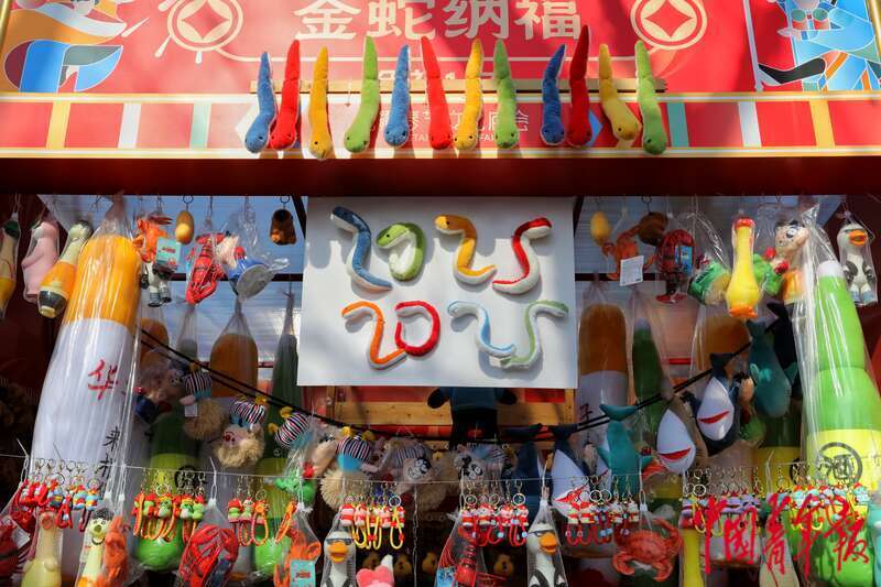 1月29日(正月初一),北京,第三十九届龙潭春节文化庙会上,庆祝北京冬奥会三周年暨奥林匹克历史知识产权授权产品——“冰墩墩”蛇年新春特别版“蛇墩墩”亮相。庙会上,各种融合传统与现代的创新文创产品、别具特色的非遗文化产品受到市民和游客的欢迎。中青报·中青网记者 李建泉/摄