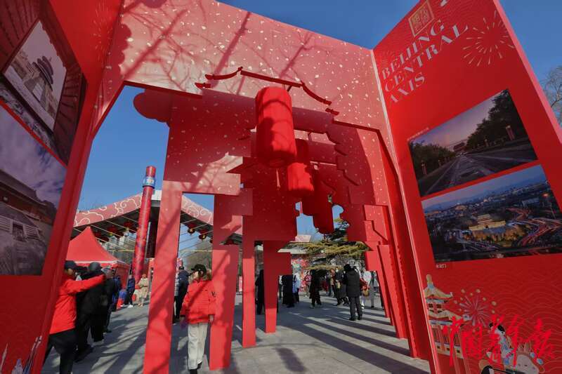 1月29日(正月初一),北京,第三十九届龙潭春节文化庙会上,游客在展示北京中轴线展区里拍照。当地时间2024年7月27日,在印度新德里召开的联合国教科文组织第46届世界遗产大会通过决议,将“北京中轴线——中国理想都城秩序的杰作”列入《世界遗产名录》。中青报·中青网记者 李建泉/摄
