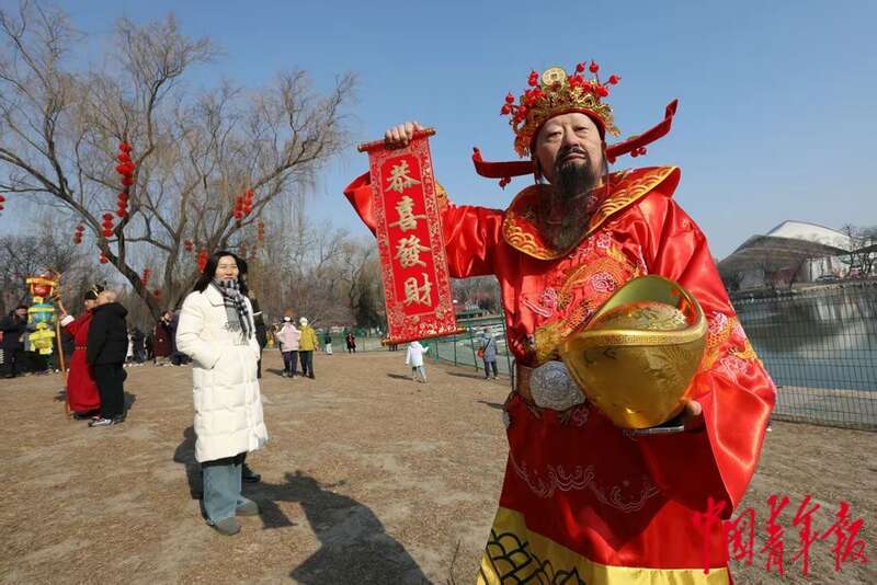1月29日(正月初一),北京,第三十九届龙潭春节文化庙会,扮成财神爷形象的老人祝游客新年好运。中青报·中青网记者 李建泉/摄