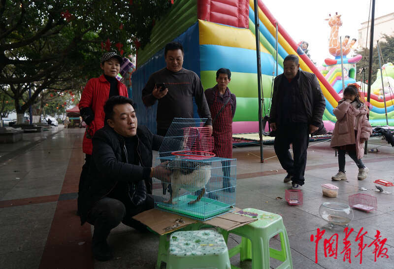 1月29日,重庆江津,在镇政府门前的广场上,一个男人玩套圈时套中了一只鹅。游戏结束后,老板把笼子中的鹅取出来拿给他,引来众人围观。中青报·中青网记者 李强/摄