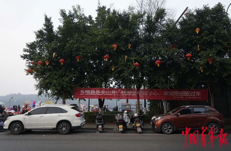 1月29日,重庆江津,白沙镇政府广场前的路上,张贴着欢迎游子回家过年的横幅,横幅上写着:“乡情最是关山月,犹照梦中游子心”。中青报·中青网记者 李强/摄