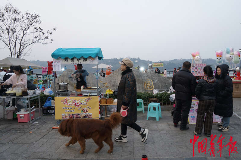 1月29日,重庆江津,白沙镇政府门前的滨江公园里也摆着许多地摊,有人卖寿司,有人卖棉花糖。中青报·中青网记者 李强/摄