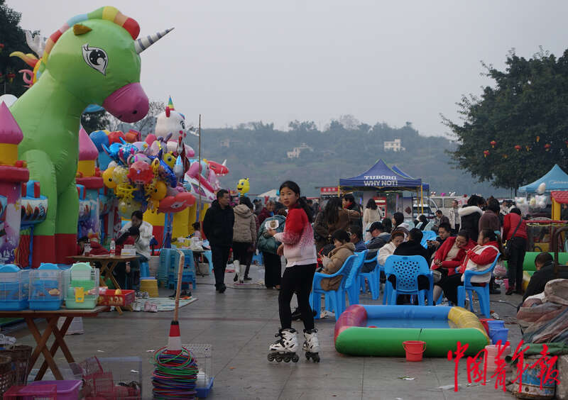 1月29日,重庆江津,白沙镇政府门前的广场上四处摆着餐饮、娱乐摊位。中青报·中青网记者 李强/摄