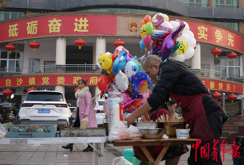 1月29日,重庆江津,一名卖气球的妇女从江津区白沙镇政府前走过,另一名卖麻辣烫的男人正在自家的小摊前忙着。他们身后不远处的镇政府办公楼上,张贴着“恭祝全镇人民新春快乐”的横幅。蛇年正月初一,在这个位于长江边的小镇上,镇政府门前格外热闹。各种地摊挤满了政府门前的小广场、滨江公园,人们在这里吃烧烤、套圈、打气球、刮彩票等,节日气氛浓厚。一位在此摆摊的小商贩告诉中青报·中青网记者,镇政府门前的这片广场允许小商小贩们春节期间摆摊,至少有20年了,这里是小镇最热闹的地方。中青报·中青网记者 李强/摄