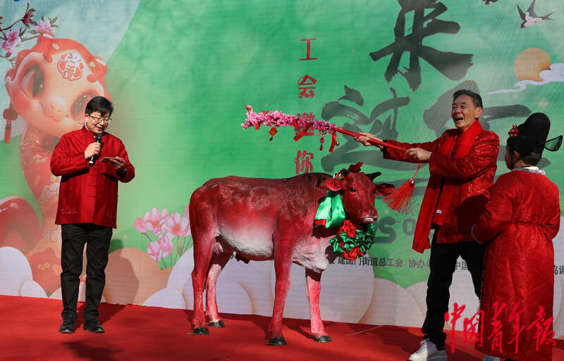 2月3日,北京古观象台,嘉宾正在进行“鞭打春牛”的传统仪式,传递对美好生活的期盼与向往。当天是农历正月初六,正值乙巳蛇年的立春之日,北京市东城区建国门街道第十八届乙巳蛇年立春文化节活动在这里举行,为市民们带来一场融合传统文化与现代活力的新春盛宴。据介绍,立春作为二十四节气中的首个节气,象征着春天的开始和万物复苏。“鞭打春牛”的民俗在我国已有3000多年的历史,是对农事的提醒,它意味着农民应该开始准备春耕工作。“一年之计在于春”,在我国传统文化中,立春是民众对整个春天以及这一年充满美好愿望的一天。中青报·中青网记者 陈剑/摄