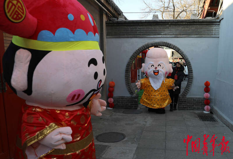 2月3日,北京古观象台,“财神”和“寿星”人偶,在立春文化节活动现场入口处,准备迎接观众的到来。中青报·中青网记者 陈剑/摄