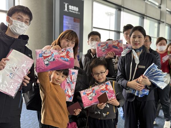 2月1日以来,哈尔滨太平国际机场进入了亚冬会参赛人员抵哈的高峰期,每天约有近20架涉亚航班抵达。图为乘坐“亚冬号”主题彩绘航班的旅客正在展示本届亚冬会主题礼品。